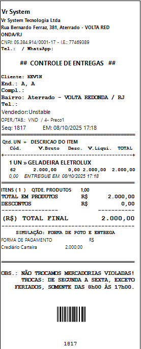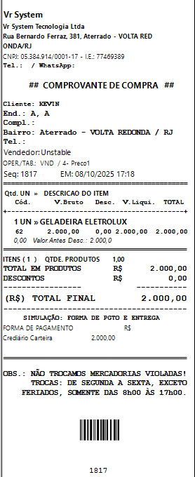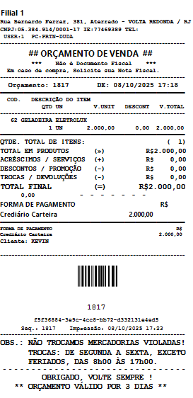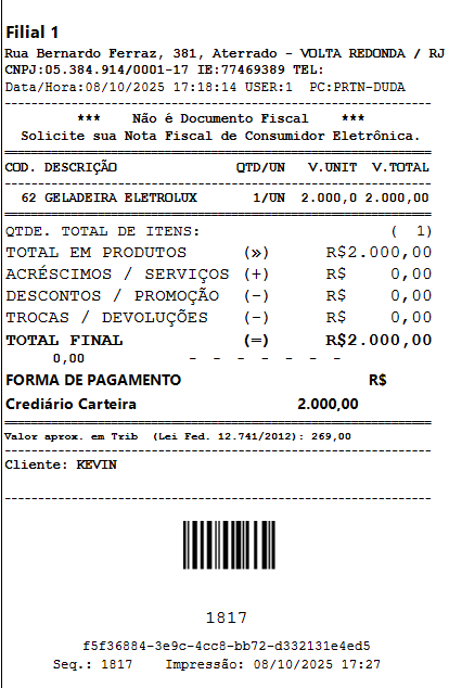 Ticket para impressão do carnê juntamente com um detalhamento da venda. No ticket sai as parcelas que o cliente tem a pagar referente a venda, ele imprime o código de barras de cada parcela, facilitando assim o recebimento. Esses códigos podem ser lidos dentro da tela de Carne Rápido na hora de efetuar o pagamento.