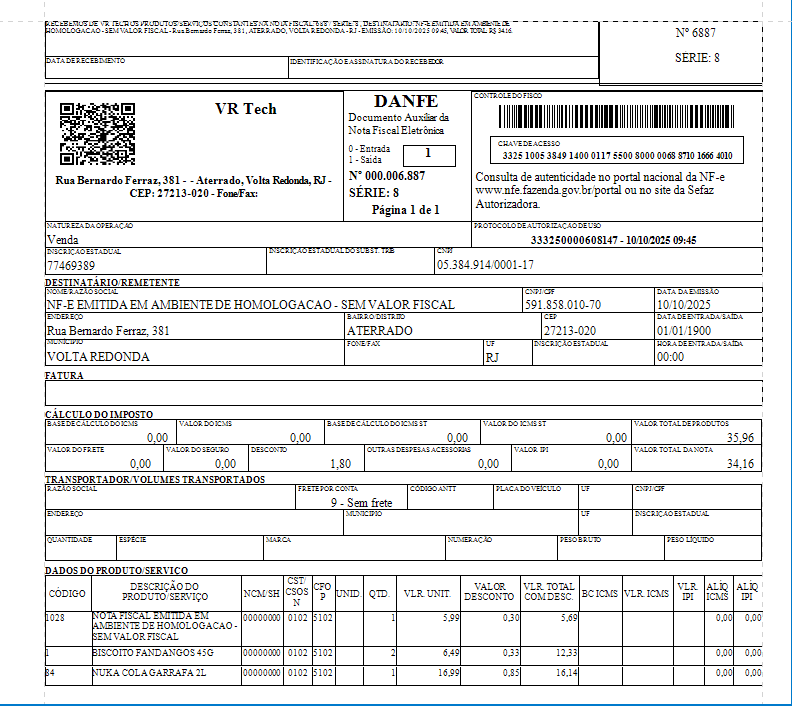 Os layout´s de nota acima são de uso único e exclusivo do software desenvolvido pela VR System, NÃO prestamos suporte a Software de Terceiros!!